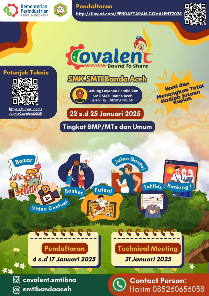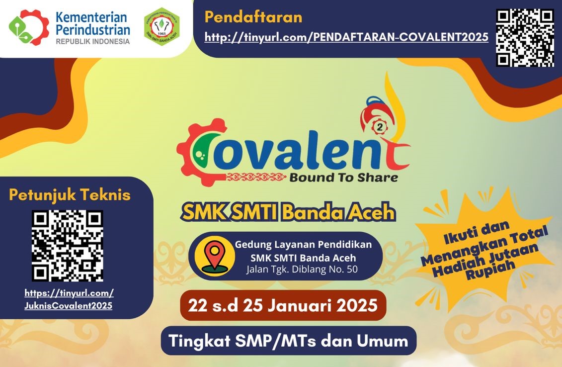 Banda Aceh – SMK SMTI Banda Aceh akan menggelar acara bertajuk Chemistry to Value and Love the Environment (COVALENT 2 Bound to Share) pada 22–25 Januari 2025. Acara ini akan berlangsung di Gedung Layanan Pendidikan SMK SMTI Banda Aceh, yang berlokasi di Jalan Tgk. Diblang No. 50, Kampung Mulia, Banda Aceh.